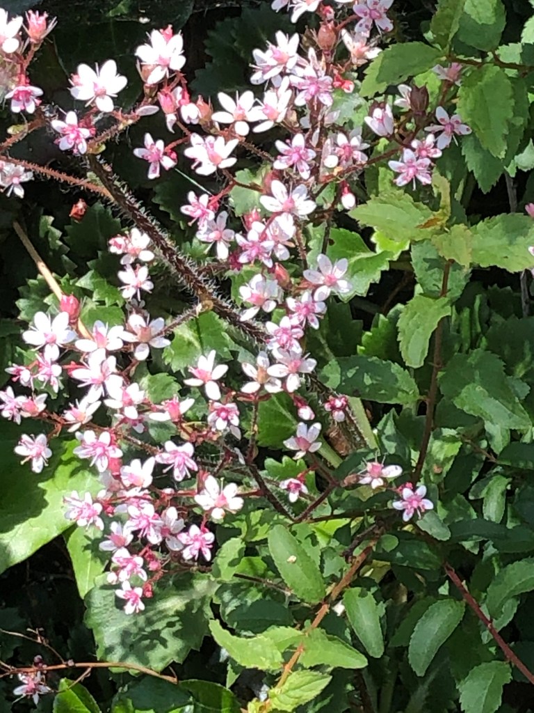 The stone ditches look splendid wearing coats of green moss with pennywort buttons topped with a collar of blush pink London pride.
